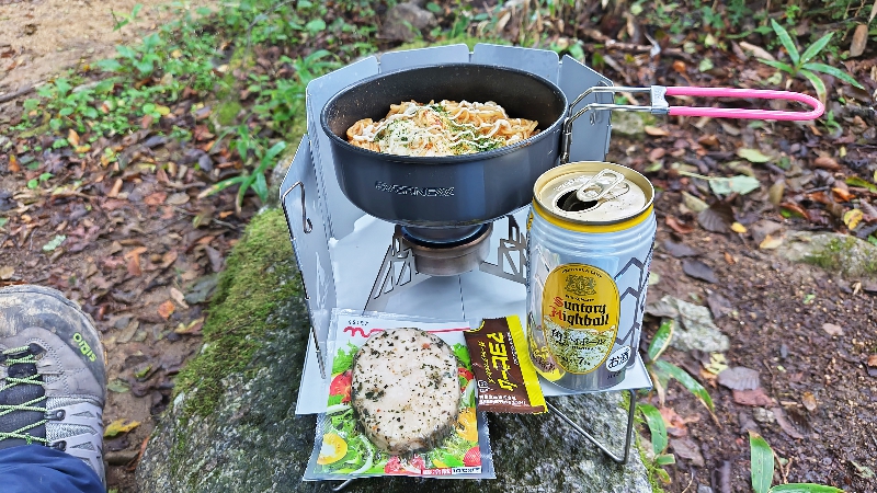 私も料理(というよりひとり男山飯)に憧れてクッカーとアルコールストーブを買い、男山飯を作っています。人が多い時は、レジャーシートを敷いて折りたたみのテーブルを安定した場所に設置して、テーブルの上で料理をしています。クッカーでお湯を沸かし、具だくせん焼きそばを作り、ほろ酔い気分。最後にドリップコーヒーでまったりと時間を過ごしています。仮眠をしたり、ぼんやりとひとりでアイデア出し、考えを整理したりして時間を過ごしています。
